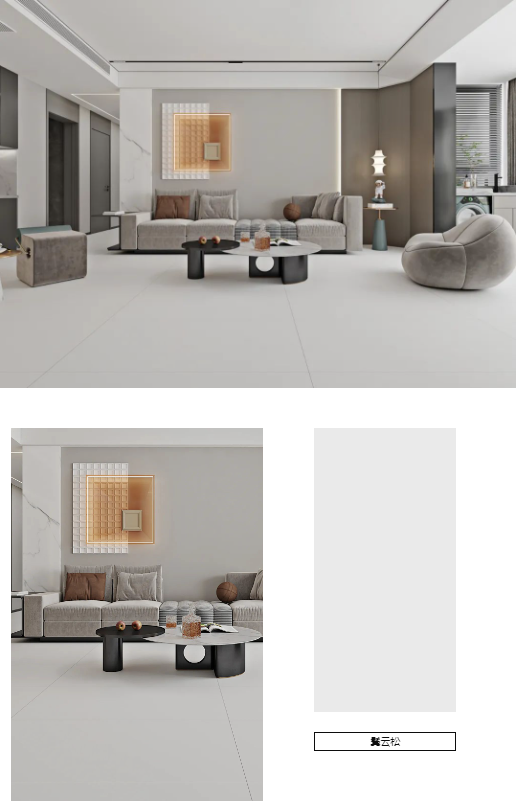 原木色系飾面板與淺灰色沙發相組合,自然低飽和的色調,一洗工作的疲憊,舒適又清透。600x1200mm宋素|凡古磚-廣寒秋通鋪地面,和諧舒適的治愈氛圍,讓空間煥發出生命的張力。