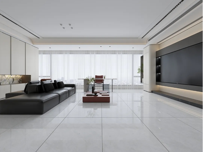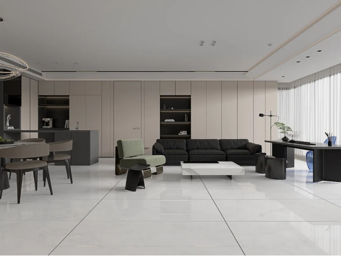 空間整體以簡潔色調(diào)奠定格調(diào),900x1800MM大規(guī)格延伸事業(yè),搭配黑色為主調(diào)的軟裝,散發(fā)出自然簡約的輕奢格調(diào)。